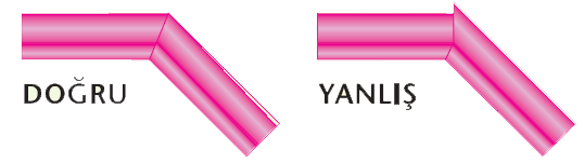 - Konferans salon basamakları gibi 135 derece (veya dereceli ) kesimlerde köşe birleşimlerine dikkat edilmeli, profilin iki tarafının da kafasından kesim açısı aynı olmalıdır. Yanı olmaz ise; basamağın üst tarafında uçlarda biri diğerinden uzun olur. Açılar aynı olursa iki uç ta aynı hizada birbirini karşılar. Aşağıdaki şekilde bu durum açıklıkta görülmektedir.