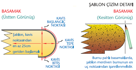 - Şablonda; kavisin düz kısımla birleştiği başlangıç, tepe ve bitiş noktalarının belirtilmesi gerekir. Ayrıca başlangıç ve bitiş noktaları arasında ölçü ve çapın merkezi ile tepe noktası arsındaki ölçü belirtilmelidir.